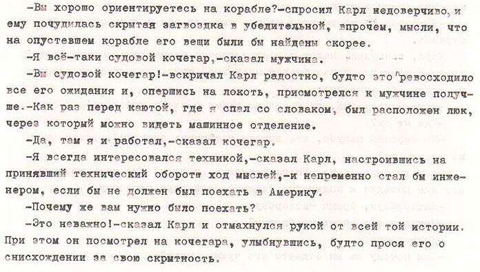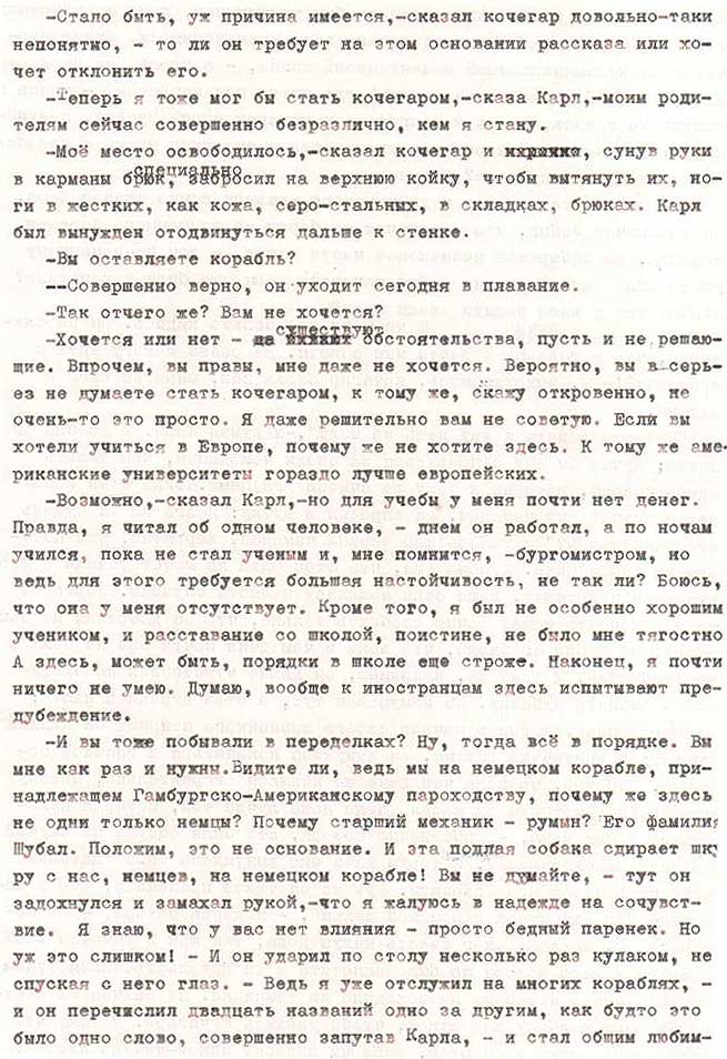 — Я готов, — сказал Карл, улыбнувшись ему, и с вызовом, так как был сильным парнем, вскинул на плечо свой чемодан. Но, взглянув на своего знакомого, который, помахивая тростью, уже смешался с толпой других пассажиров, он растерялся, вспомнив, что забыл в каюте свой зонт. Он попросил знакомого, пожалуй, не слишком осчастливленного этим, оказать ему любезность и присмотреть за его чемоданом, огляделся, чтобы сориентироваться при возвращении, и поспешил прочь. Внизу, к своему сожалению, Карл обнаружил, что проход, который очень сократил бы его путь, впервые оказался закрыт, что, по-видимому, было связано с полной высадкой пассажиров, и был вынужден разыскивать трапы, снова и снова следовавшие друг за другом, проходить то и дело заворачивающими коридорами, мимо пустых кают с одинокими письменными столами, — до тех пор, пока на самом деле, так как проходил этим путем раз или два и всегда в большой компании, окончательно и бесповоротно не заблудился. В растерянности, не видя кругом ни души, а только слыша над собою беспрерывно текущий тысяченогий людской поток и улавливая далекий отзвук уже остановленных машин, он, не раздумывая, принялся стучать в первую попавшуюся маленькую дверь, у которой остановился в своих блужданиях.